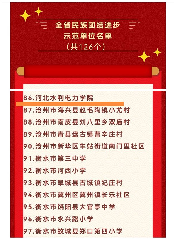 12月26日,河北省民族事务委员会发布命名文件,公布了省级民族团结进步示范区示范单位名单,全省共评选出19个民族团结进步示范区和126个示范单位,我校被命名全省民族团结进步示范单位!一直以来,我校党委高度重视民族工作,将民族团结作为构建“大统战”工作格局重要抓手,通过创新方式方法,找准心理契合点、情感共鸣点和价值结合点,在育人工作中突出“中华民族一家亲、同心共筑中国梦”这一主线,努力加强各民族师生交流交融,...