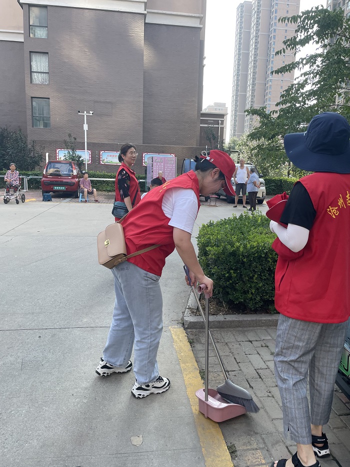 活动中,各位教师党员身穿红色志愿服,携带扫帚、簸箕、垃圾袋等清扫工具,对凤凰城A区路面以及绿化带内的果皮纸屑、烟头、落叶等垃圾进行彻底清理,消除垃圾死角,并对小区内随意乱放的非机动车辆摆放整齐,确保停车秩序。天气虽然炎热,但是教师党员们个个干劲十足,经过1个多小时的集中清理,使社区环境更有序、更和谐。