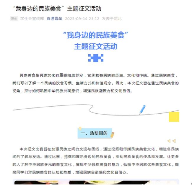 2023年9月是我省第14个民族团结进步宣传月,为全面贯彻落实习近平总书记关于加强和改进民族工作的重要思想以及视察河北重要讲话和重要指示批示精神,9月6日—28日,我校以铸牢中华民族共同体意识为主线,组织师生开展了丰富多彩的民族团结进步宣传月系列活动。