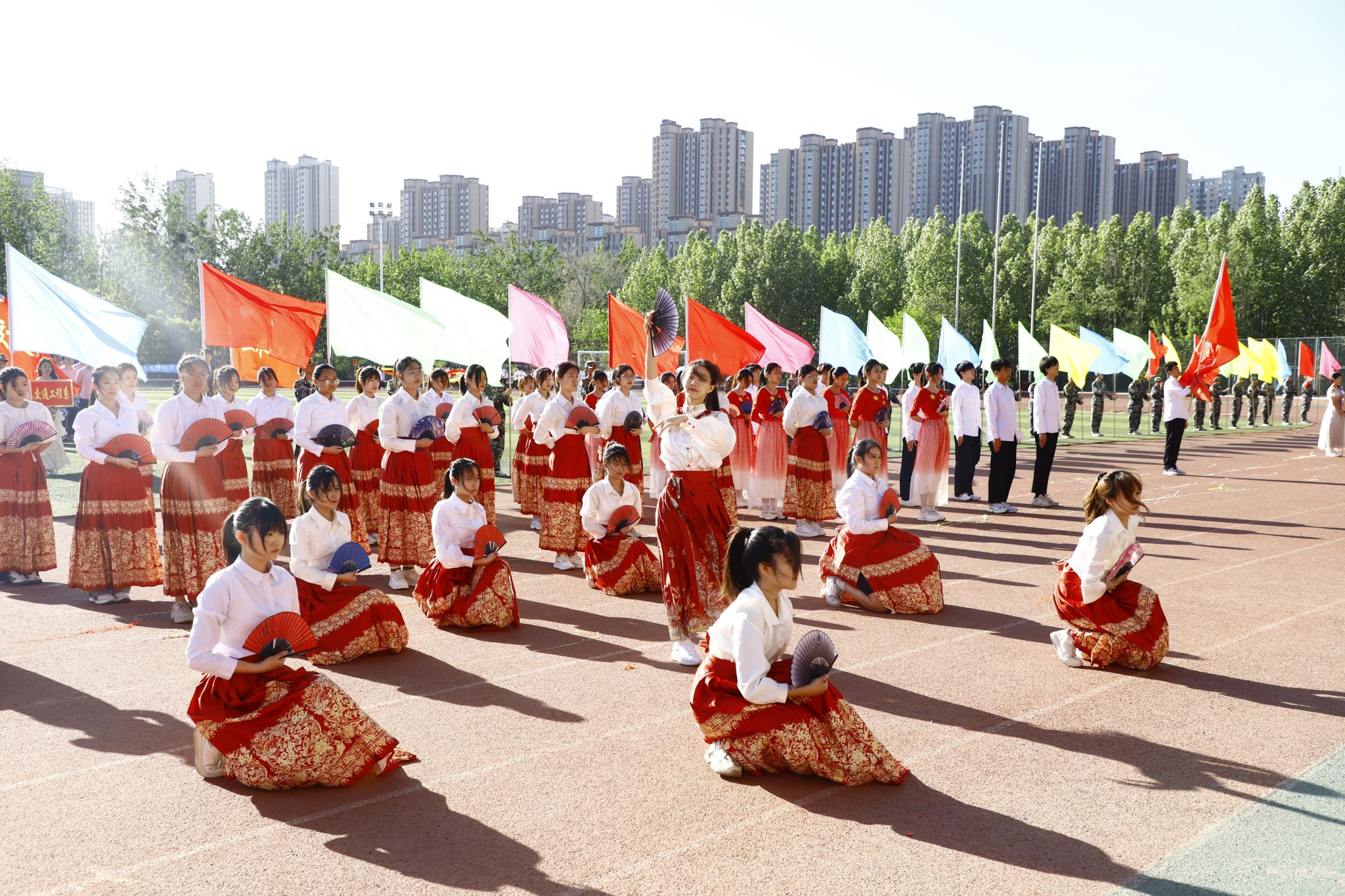入场式上,伴随着《运动员进行曲》铿锵的旋律,国旗护卫队、旗林队、裁判员方阵及各系代表队依次入场。随后,四百余名同学精彩的文体表演将现场气氛推向高潮。