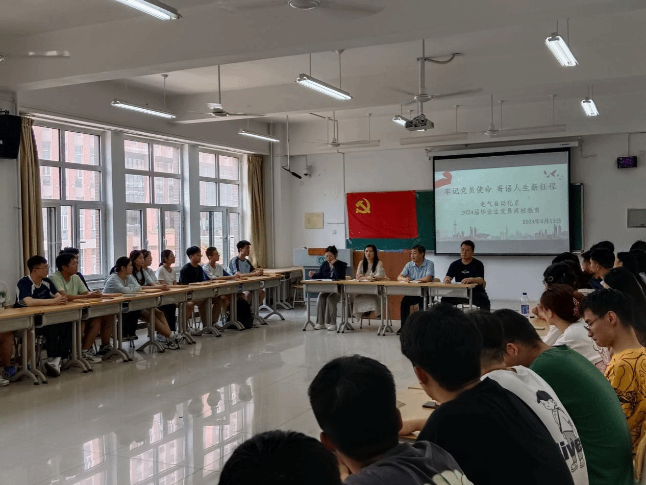 为扎实做好2024届毕业生党员教育工作,引导广大毕业生党员坚定理想信念,以不懈努力践行青年学子的使命和担当,充分发挥毕业生党员在文明离校中的模范带头作用,增强归属感、责任感和使命感,电气自动化系于6月13日下午在创新楼A212召开2024届毕业生党员主题教育活动。电气自动化系党总支书记葛洪伟、团委书记张宁、学生一二支部书记董钊睿、陈硕老师共同参加此次活动。