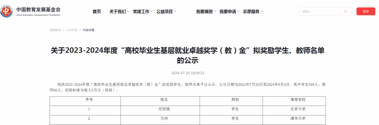 “全国高校毕业生基层就业卓越奖学(教)金”是由教育部高校学生司(高校毕业生就业服务司)、教育部学生服务与素质发展中心共同指导,中国长江三峡集团有限公司出资,中国教育发展基金会设立的项目,奖励对象为赴基层就业并做出突出业绩的普通高校毕业生和普通高校指导服务大学生赴基层就业工作有突出贡献的教师。本年度全国共评选出“高校毕业生基层就业卓越奖学金”398人,“高校毕业生基层就业卓越奖教金”60人。