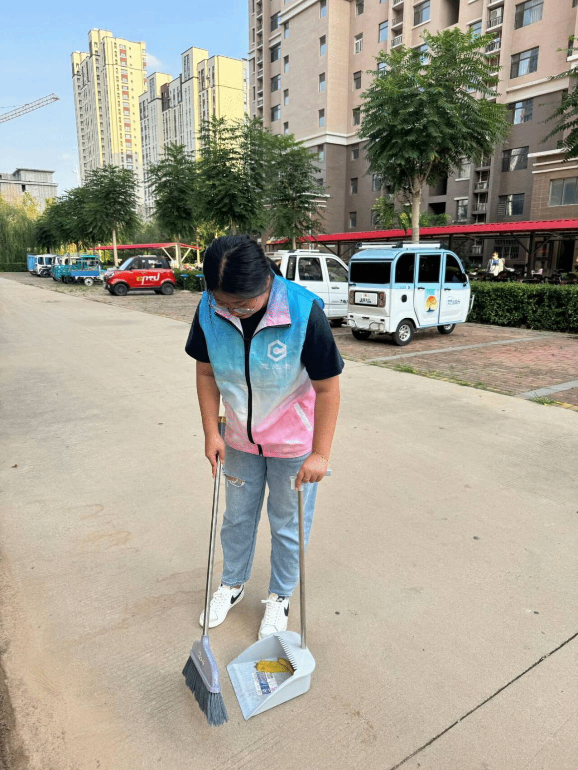 清洁小组的志愿者们手持扫帚、垃圾袋等工具,对社区道路、绿化带及休闲区进行了全面细致的清扫。经过一番努力,社区环境焕然一新,赢得了过往居民的一致好评。与此同时,另一组志愿者将被风吹倒的自行车一一扶起,把随意停放的自行车在指定的停车区域整齐排列,原本杂乱无章的停车区变得井然有序,不仅美化了社区环境,也方便了居民的出行。