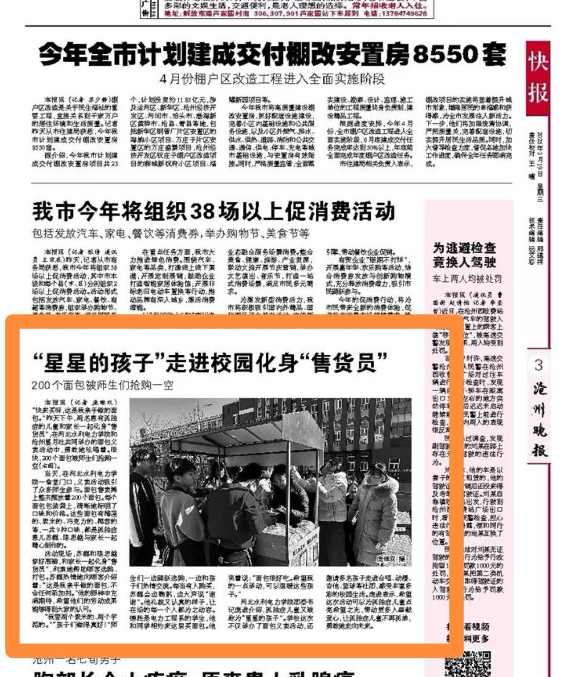 3月19日,《沧州晚报》报道我校义卖活动