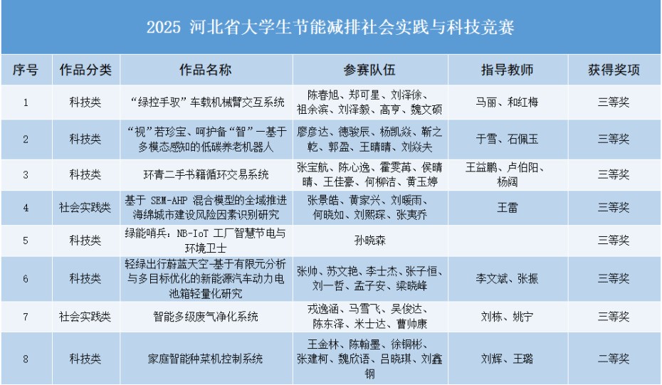 近日,河北省教育厅公布了2025年“西门子杯”中国智能制造挑战赛(华北三赛区)、2025年河北省大学生节能减排社会实践与科技竞赛等各类学科竞赛获奖名单,我校学子凭借扎实的专业知识、过硬的实践能力和创新精神,在智能制造、节能减排、电子设计、结构设计、市场调查等多个领域的竞赛中脱颖而出,共获奖项49项,其中一等奖7项、二等奖14项、三等奖25项、优秀组织奖3项,充分展现了学校在人才培养和学科建设方面的卓越成效。